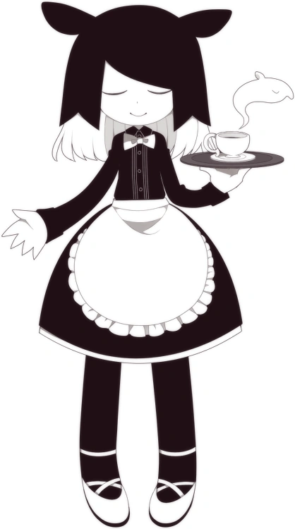 Cumu has white skin and layered hair: the top layer and her ears are both black, and the bottom layer is white. She wears a monochrome waitress uniform with a white bowtie and apron. She also wears black tights and white strappy flats with black soles. Her eye color is unknown as her eyes are closed in both an illustration and her character portrait. In her character portrait, she can be seen holding a white teacup as well.