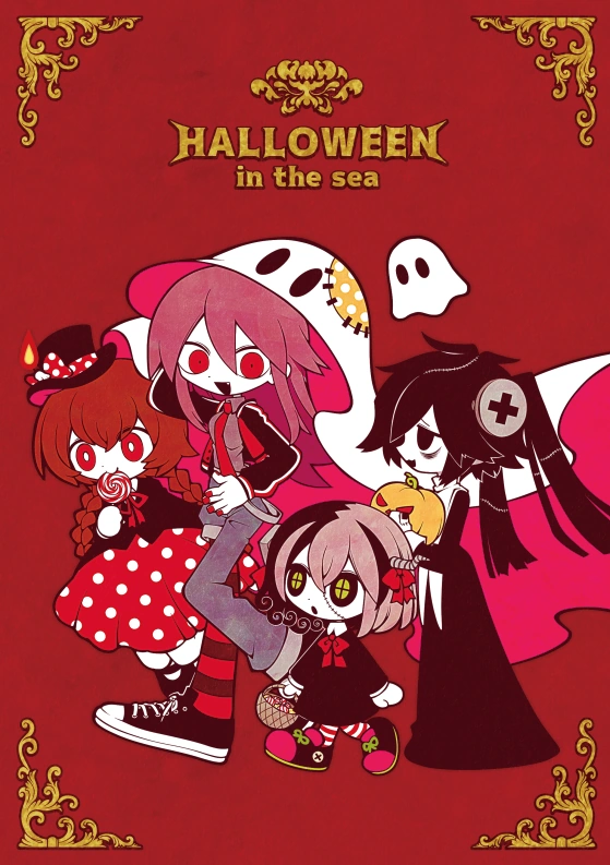 Halloween in the sea is an artbook by Deep-Sea Prisoner. It was published on the 24th of October, 2019. The book features various Halloween-based and inspired artworks of her characters. It contains 14 pages, is pay-to-read, and available for purchase on BOOTH and AliceBooks. The book is currently only available for physical purchase, meaning no digital copies are sold.