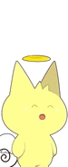Like a typical Mogeko, Hasu had a cute cheery expression, pale yellow fur, a curly tail, and furry cat ears. On the top of his head were fluffy spikes of fur. However, unlike a normal Mogeko, he had a golden halo floating above his head and a pair of white angelic wings on his back.