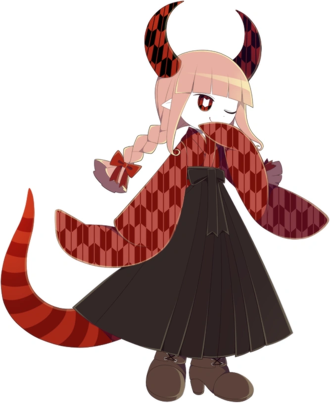 Laurentia has salmon colored hair styled into twin braids tied with red ribbons. She also has raceless white skin. Her eyes have red and black irises with a yagasuri pattern as well as white pupils following this pattern. Her horns share the same pattern as her kimono, though her kimono is two-toned with dark and light reds instead of red and black. She wears a dark brown hakama with a red striped tail peeking out from underneath and light brown lace-up boots.
