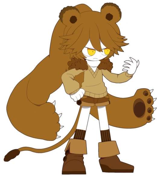Leona has bright yellow eyes and dark orange hair. Her ponytail splits into two halves and ends with lion paws. She wears a white turtleneck beneath a light orange sweater. She also wears dark orange shorts with two dark brown buttons, striped orange socks going below her knees, and orange boots folded outwards. She also has ears and a tail resembling a lion's.