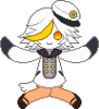 She wears a white sailor-like dress reaching slightly below her hips. The collar, pocket edge, and lower portion of the sleeves are accented with black and a small golden anchor design is found in the lower left corner. The front of the dress contains a large light gray oval with slightly darker lining and six golden buttons. Memoca also wears tan stockings and black Mary Jane shoes.