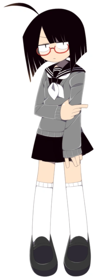 Niramigawa has black hair in a bob style with an ahoge. Her eyes are black. She also has red framed glasses. She wears a black seifuku topped with a gray sweater and black pleated skirt. She also wears white socks with a pair of dark gray loafers.