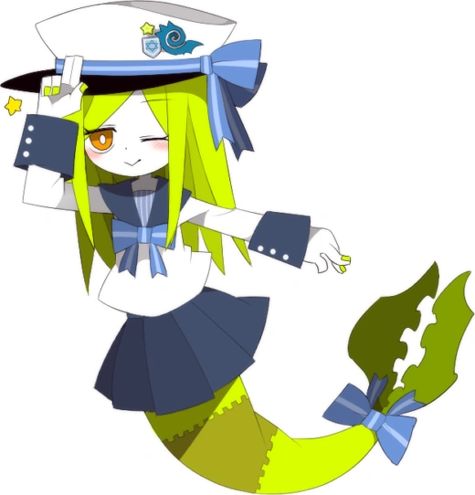 Reley Lo has raceless white skin, long yellowish green hair, orange eyes with white pupils, and yellowish green nails. She wears a blue-bowed sailor suit and a black-brimmed hat with an unknown crest on it. She also has a yellowish green mermaid tail with a striped blue bow on the end.