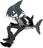 He wears a black fur trimmed jacket with an oval containing a white anchor and red streak across it on the upper arm along with two small scratch marks under it. Underneath the jacket is a light gray shirt and anchor necklace. Near the cuffs of his jacket appear to be small fins. His pants are dark gray. He also wears a black belt, black gloves, and black shoes. Towards the true ending of the game, Samekichi's appearance slightly changed. His hair color turned into more of a dark blue-green color, and his eye color changed into navy blue. The reason for this change to a darker shade was due to him becoming tinted with the darkness after having pursued Syakesan. [1] There is still a scar mark on his right eye remaining. His dorsal fin turned a little bit raggier, and there are more scars on his tail. His uniform changed too; he now wears a darker jacket with black fur trim and a black shirt underneath. The red streak from the anchor patch on his jacket was also removed. Even though they are not visible, Samekichi has ears. [2] He also has blue nails. [3]