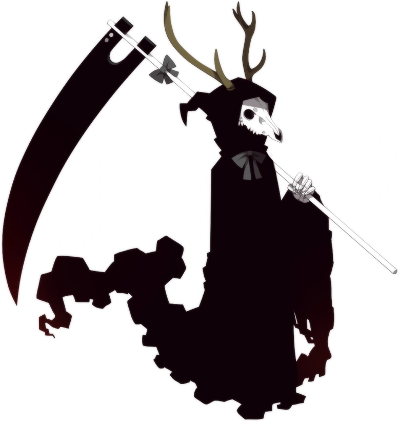 Shikabone takes the form of a classic reaper with a long flowing black hooded cloak, except it is adorned by a gray ribbon beneath his neck. He also has the head of a bleached deer skull, the antlers protruding from the top of his head. He is often portrayed with a large black bladed scythe also decorated with a gray ribbon. His hands are skeletal.