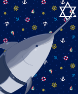 Shisatsu is a swordfish (or broadbill) appearing to wear a navy blue saddle.